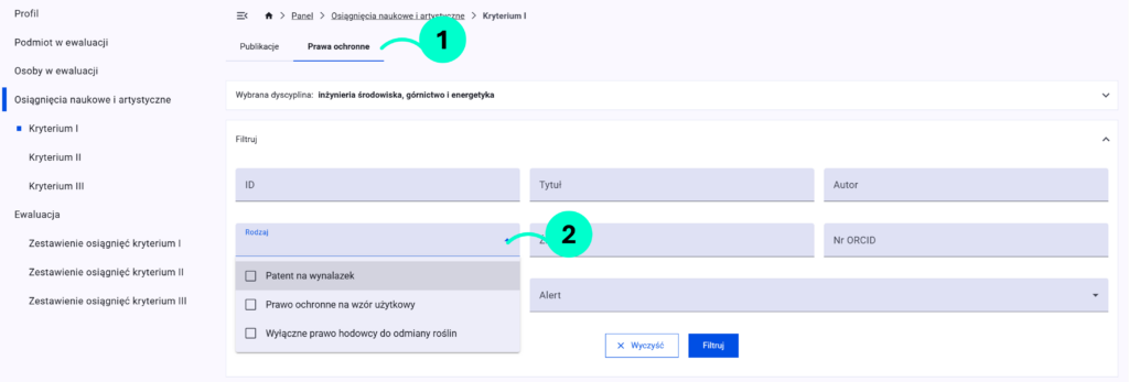 Aby wyszukać patent, w Kryterium I przejdź do zakładki Prawa ochronne (1), a następnie w filtrach wyszukiwania wybierz w Rodzaj osiągnięcia (2) odpowiednio opcję: