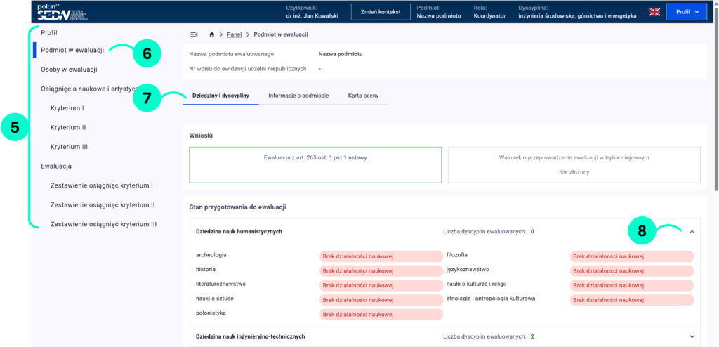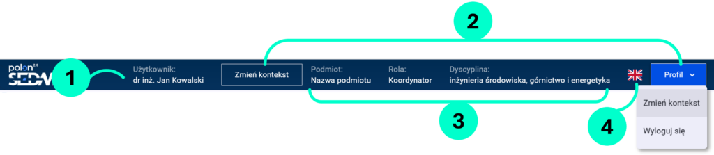 - Przycisk do zmiany kontekstu (wyboru innego podmiotu/roli/dyscypliny), który dostępny jest też po kliknięciu w „Profil” (2),